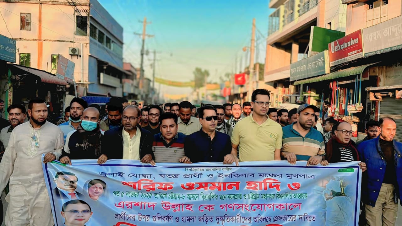জুলাই যোদ্ধা, স্বতন্ত্র এমপি প্রার্থী ইনকিলাব মঞ্চের মুখপাত্র শরিফ ওসমান হাদী ও গত ৫ নভেম্বর/২৫ ইং তারিখে চট্টগ্রাম ৮ আসনে বিএনপির মনোনয়নপ্রাপ্ত ও চট্টগ্রাম মহানগর বিএনপির আহবায়ক এরশাদ উল্লাহ কে গণসংযোগ কালে প্রার্থীদের উপর গুলিবর্ষণ ও হামলা জড়িত দুষ্কৃতকারীদের অবিলম্বে গ্রেফতারের দাবীতে মাদারগঞ্জে বিক্ষোভ মিছিল অনুষ্ঠিত হয়েছে।