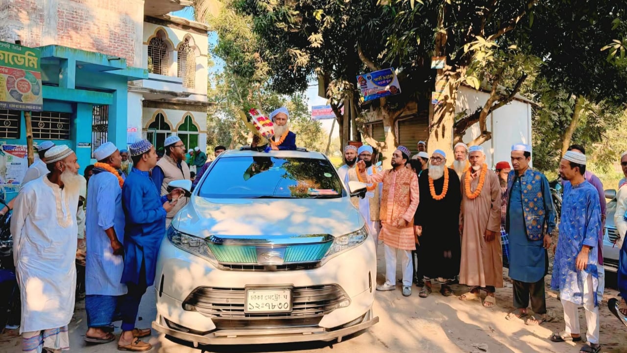 অনুষ্ঠানে ফুল দিয়ে তাকে শুভেচ্ছা ও ভালোবাসা জানানো হয়। পরে ছাদখোলা গাড়িতে করে এলাকাজুড়ে ঘুরিয়ে তাকে সম্মান জানিয়ে বিদায় দেওয়া হয়, যা উপস্থিত মুসল্লিদের মধ্যে আবেগঘন পরিবেশের সৃষ্টি করে।