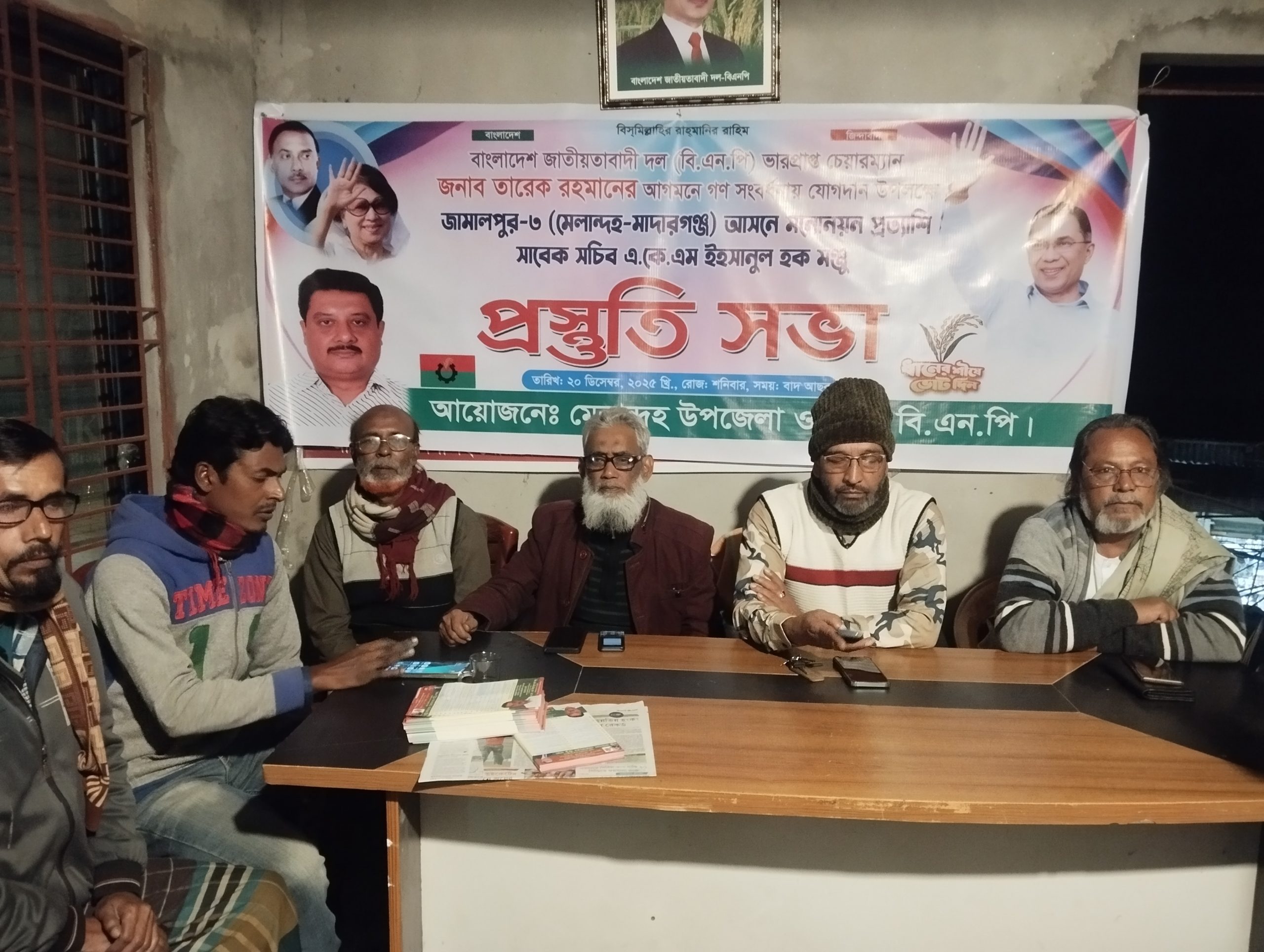 শনিবার (২০ ডিসেম্বর) সন্ধ্যা ৬টায় মেলান্দহ উপজেলা ও পৌর বিএনপির একাংশের আয়োজনে মেলান্দহ বাজারস্থ শাপলা মার্কেটের দ্বিতীয় তলায় এ প্রস্তুতি সভা অনুষ্ঠিত হয় । প্রস্তুতি সভায় প্রধান অতিথি হিসেবে ভার্চুয়ালি বক্তব্য রাখেন সাবেক সচিব এ কে এম ইহসানুল হক মঞ্জু।