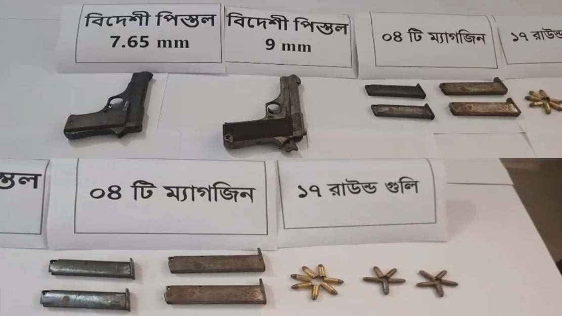 ঠাকুরগাঁও জেলা পুলিশ বালিয়াডাঙ্গী উপজেলায় বিশেষ অভিযানে দুটি বিদেশি পিস্তল, চারটি ম্যাগজিন এবং ১৭ রাউন্ড গুলি উদ্ধার করেছে।