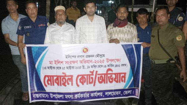 লালমোহনে মা ইলিশ সংরক্ষণ অভিযানে জাল-মাছ জব্দ