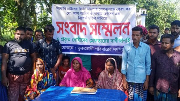 ‎সংবাদ সম্মেলনে দাবি করা হয়, চাল জব্দের ঘটনার পর স্থানীয় কিছু প্রভাবশালী মহলের ইন্ধনে ডিলার লাবু, সজিব এবং শামসুদ্দিনের পক্ষ থেকে চাল উদ্ধারের ঘটনাটিকে ভিন্ন খাতে প্রবাহিত করার চেষ্টা করা হচ্ছে। এর ফলস্বরূপ সাদ্দাম হোসেন ও আল আমিনকে আসামি করে মিথ্যা ও হয়রানিমূলক মামলা দায়ের করা হয়েছে। মূল অভিযুক্ত ডিলারদের আড়াল করতেই সাধারণ নিরীহ মানুষকে ফাঁসানো হচ্ছে। এই মিথ্যা মামলার কারণে তাদের পরিবার চরম উদ্বেগ ও উৎকণ্ঠার মধ্যে দিন কাটাচ্ছে।