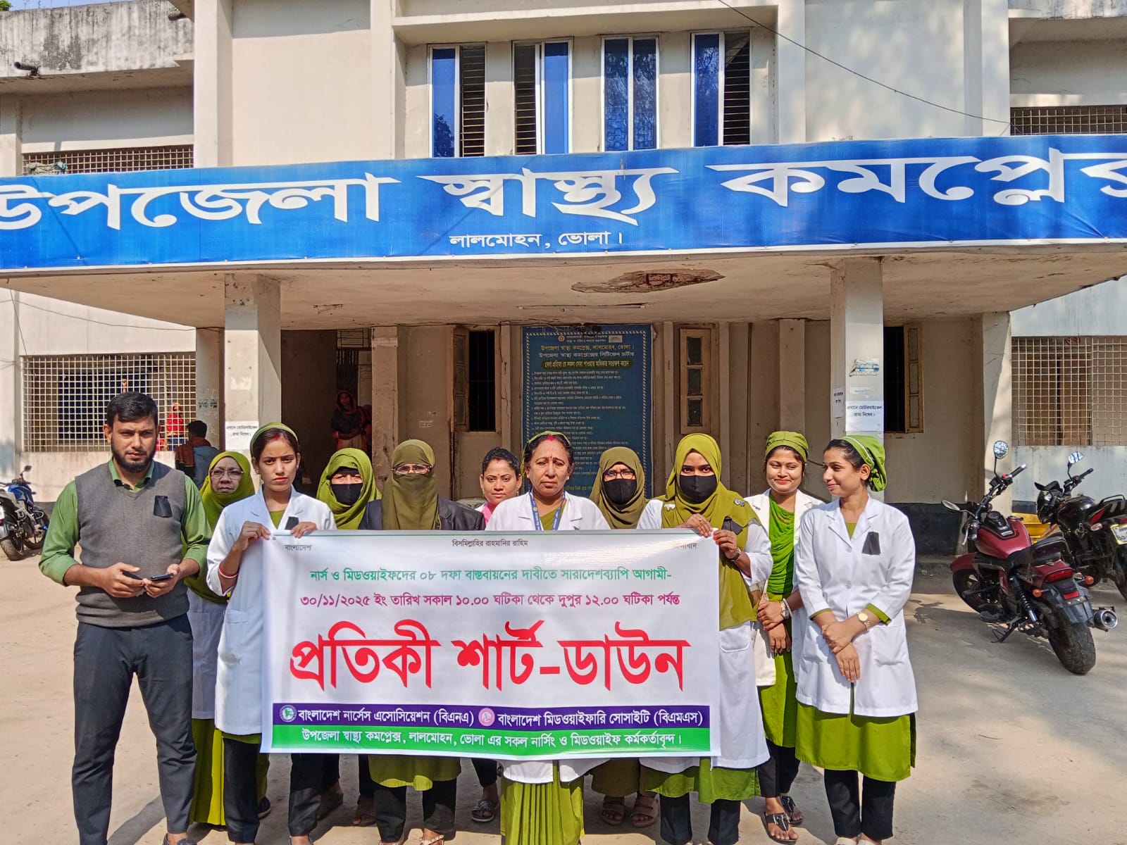 জানা যায়,৪৮ বৎসরের ঐতিহ্য ও অগ্রগতির স্বতন্ত্র নার্সিং প্রশাসন, নার্সিং ও মিডওয়াইফারি অধিদপ্তরকে বিলুপ্ত করে ভিন্ন অধিদপ্তরে একিভূত করনের অপচেষ্টার প্রতিবাদে এবং আশ্বাস প্রদানের ১৪ মাসেও বাস্তবায়ন না হওয়া দাবীগুলো বাস্তবায়নের দাবীতে বাংলাদেশ নার্সেস এসোসিয়েশন (বিএনএ) ও বাংলাদেশ মিডওয়াইফারি সোসাইটি (বিএমএস) স্বাস্থ্য কমপ্লেক্স লালমোহন, ভোলা এর সকল নার্সিং ও মিডওয়াইফ কর্মকর্তাবৃন্দের পক্ষ হতে প্রতিকী শাট ডাউন পালিত হয়।