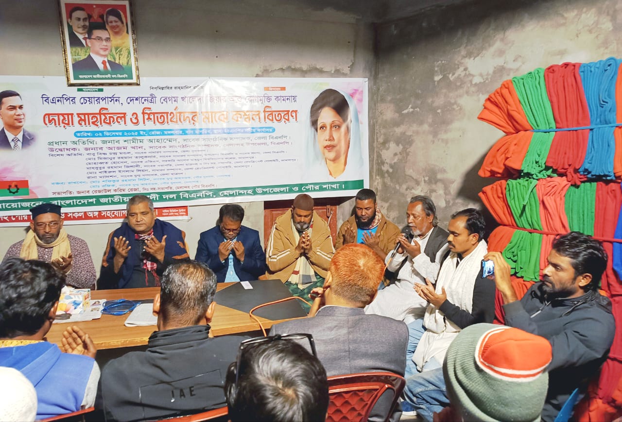 বিএনপির চেয়ারপার্সন বেগম খালেদা জিয়ার আশু রোগমুক্তি কামনায় জামালপুরের মেলান্দহে দোয়া মাহফিল ও কম্বল বিতরণ করেছে মেলান্দহ উপজেলা জাতীয়তাবাদী দল বিএনপি ও পৌর বিএনপি।