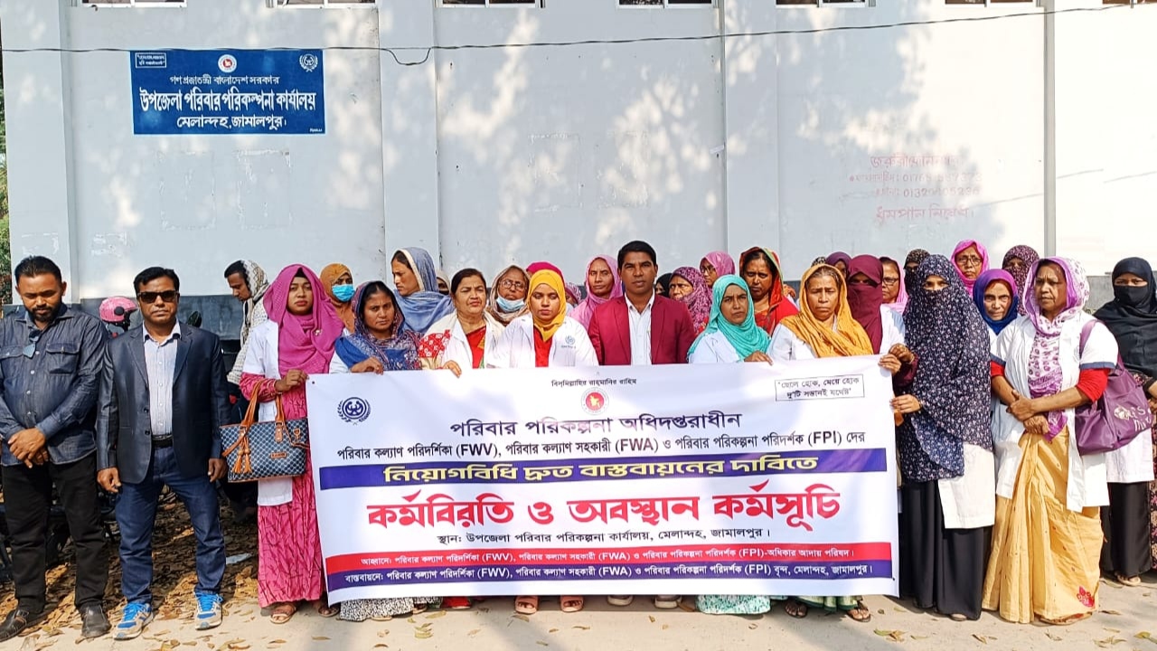 কেন্দ্রীয় কর্মসূচীর অংশ হিসেবে পরিবার কল্যাণ পরিদর্শিকা (FWV), পরিবার পরিকল্পনা পরিদর্শক (FPI) ও পরিবার কল্যাণ সহকারী (FWA) কর্মীদের সংগঠনের উদ্যোগে নিয়োগ বিধি ২০২৪ দ্রুত বাস্তবায়নের দাবিতে মেলান্দহে কর্ম বিরতি ও অবস্থান কর্মসূচি পালন করা হয়েছে। মঙ্গলবার (২ ডিসেম্বর) পরিবার কল্যাণ কর্মীদের অধিকার আদায় পরিষদের আহবানে উপজেলা পরিবার পরিকল্পনা কার্যালয়ের সামনে তাঁরা এই কর্মসূচি পালন করেন।