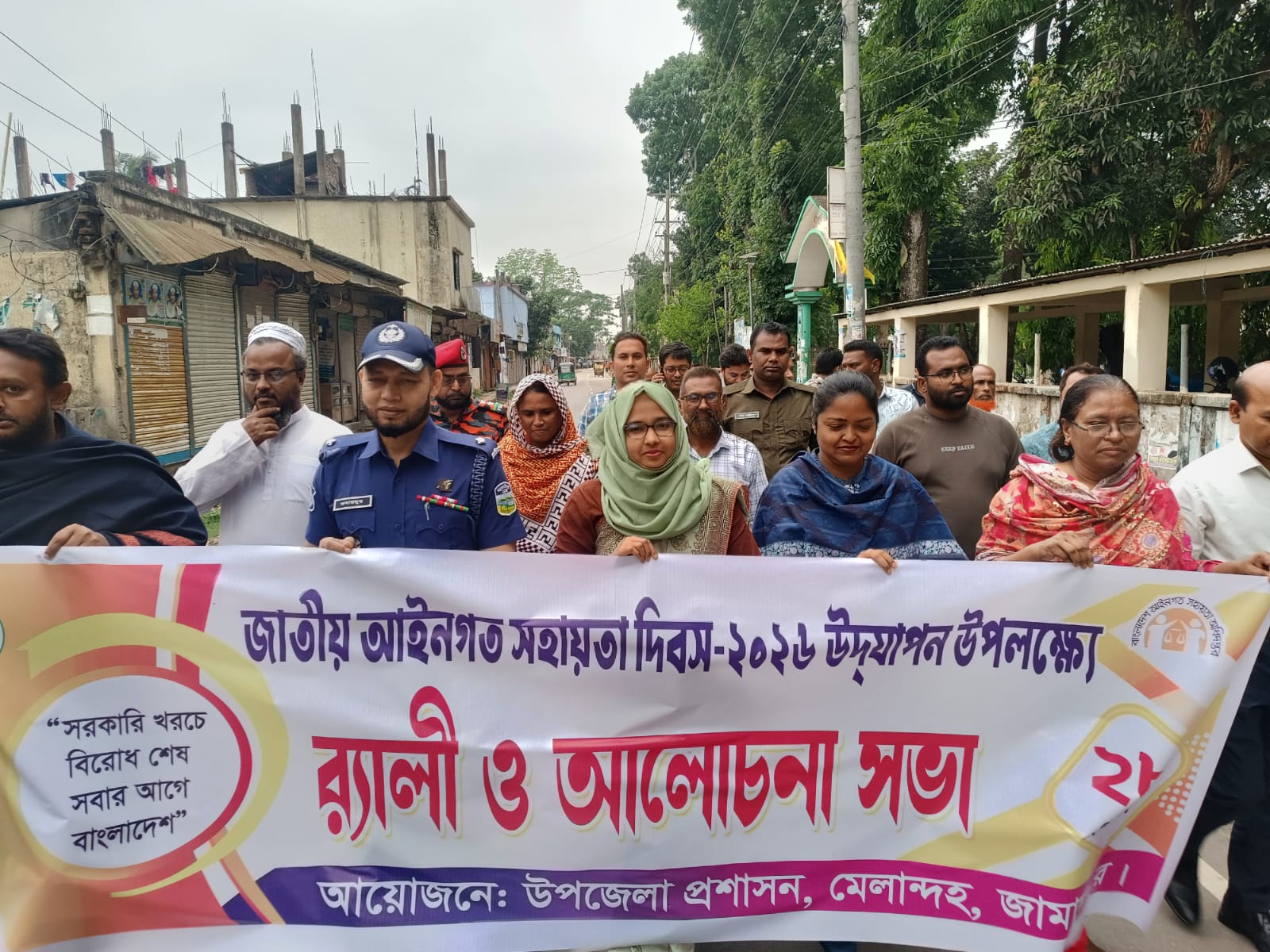 জামালপুরের মেলান্দহে বর্ণাঢ্য আয়োজনের মধ্য দিয়ে জাতীয় আইনগত সহায়তা দিবস পালিত হয়েছে। ‘সরকারি খরচে বিরোধ শেষ, সবার আগে বাংলাদেশ’ এই প্রতিপাদ্যকে সামনে রেখে মঙ্গলবার (২৮ এপ্রিল) বিকেল সাড়ে ৩ টায় উপজেলা প্রশাসনের আয়োজনে সচেতনতামূলক র্যালি ও আলোচনা সভার আয়োজন করা হয়।