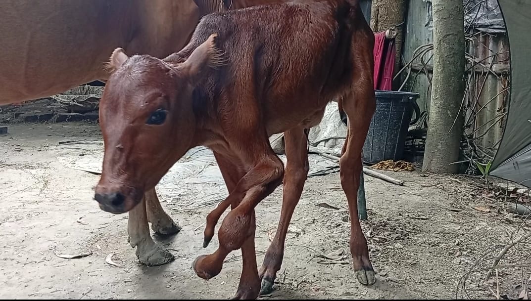 পাঁচ পা নিয়ে জন্ম নেয়া গরুর বাছুর, কেউ কেউ বলছেন সৌভাগ্যের প্রতীক। ছবিঃ চ্যানেল ১১ নিউজ টাঙ্গাইলের গোপালপুর উপজেলায় জন্ম নিয়েছে এক বিরল আকৃতির গরুর বাছুর, যার রয়েছে স্বাভাবিক চার…